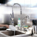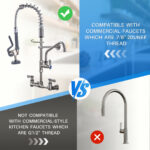 This pre-rinse commercial kitchen spray head turns out to be designed for a wide variety of pre-rinse commercial faucets on the market, providing a 1.42 GPM high pressure spray when the handle is pressed, and is widely used in restaurants, hotels, cafes, or other heavy-duty industrial kitchens. Commercial sink sprayers feature rubberized nozzles that prevent hard water and scale buildup and are easy to operate and maintain. The plastic lever handle allows you to press down on the commercial faucet sprayer to divert the water flow from the main spout, and when used with an O-ring, this sink sprayer works continuously, freeing up your hands. The attachment comes with solid brass fittings to prevent any leaks.