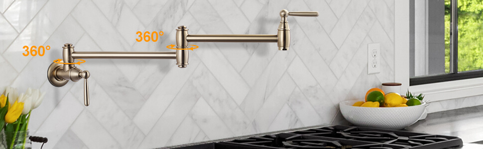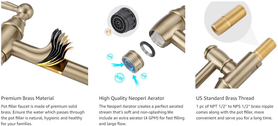 • Facilitating Your Life: Modern wall mounted brushed gold pot filler in brushed gold is your kitchen’s perfect complement. Use it to quickly and easily fill large cooking vessels without having to walk from the sink to the stove and spill all your water.