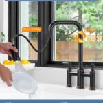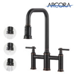 Flexible Design: High arched 360 degree swivel spout is large and comfortable to reach around the sink, giving your kitchen sink a full range of washes. High arc 360° rotating faucet is also perfect for double sink. Bridge faucet with smart double lever handle for easy control of hot&cold water temperature and flow