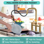 Brass Double Handle Deck Mounted Bridge Kitchen Faucet with Pull-Down Spray Head in Brushed Gold