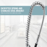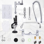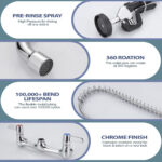 The commercial kitchen faucet with pull-down sprayer and pre-rinse sprayer features a modern and stylish design with an exquisite appearance, adding an elegant and refined artistic touch to your kitchen. Kitchen sink faucet with high arc spring ring nozzle and pull-down design can effectively expand the rinsing range, providing unlimited convenience for your kitchen work. Eye-catching and exquisite chrome surface treatment can effectively prevent fingerprints and water stains attached, easy to daily maintenance, high-quality coating materials to ensure the service life of the product, but also add a touch of sophistication. The three-handle design allows for precise control of water flow, the pull-down sprayer enhances versatility, and the pre-rinse function simplifies kitchen work. The kitchen sink faucet features a solid brass construction that is corrosion and rust resistant for durability. Remodel and upgrade your kitchen with this kitchen sink faucet with sprayer and enjoy a truly innovative lifestyle.