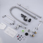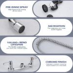 The commercial kitchen faucet with pull-down sprayer and pre-rinse sprayer features a modern and stylish design with an exquisite appearance, adding an elegant and refined artistic touch to your kitchen. Kitchen sink faucet with high arc spring ring nozzle and pull-down design can effectively expand the rinsing range, providing unlimited convenience for your kitchen work. Eye-catching and exquisite chrome surface treatment can effectively prevent fingerprints and water stains attached, easy to daily maintenance, high-quality coating materials to ensure the service life of the product, but also add a touch of sophistication. The three-handle design allows for precise control of water flow, the pull-down sprayer enhances versatility, and the pre-rinse function simplifies kitchen work. The kitchen sink faucet features a solid brass construction that is corrosion and rust resistant for durability. Remodel and upgrade your kitchen with this kitchen sink faucet with sprayer and enjoy a truly innovative lifestyle.