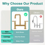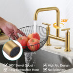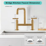 The heavy duty bridge faucet is made of high quality solid brass and stainless steel. The rust, corrosion, and leak resistant brass kitchen sink faucet features a premium finish to ensure water safety and a long, durable life. The dual handle design allows for precise control of water temperature and flow, and the handles have clear hot and cold markings to help simplify your cleaning routine. The faucet body is designed with smooth lines and modern style, making this kitchen sink faucet the finishing touch to your upgraded kitchen, and its modern style matches well with any decor style kitchen. The high arc 360 rotatable spout effectively expands the operable range and is suitable for single or double sinks with 2-hole installation.