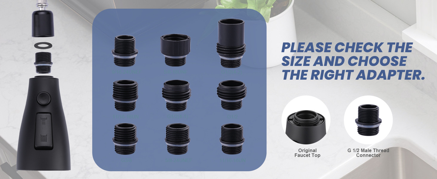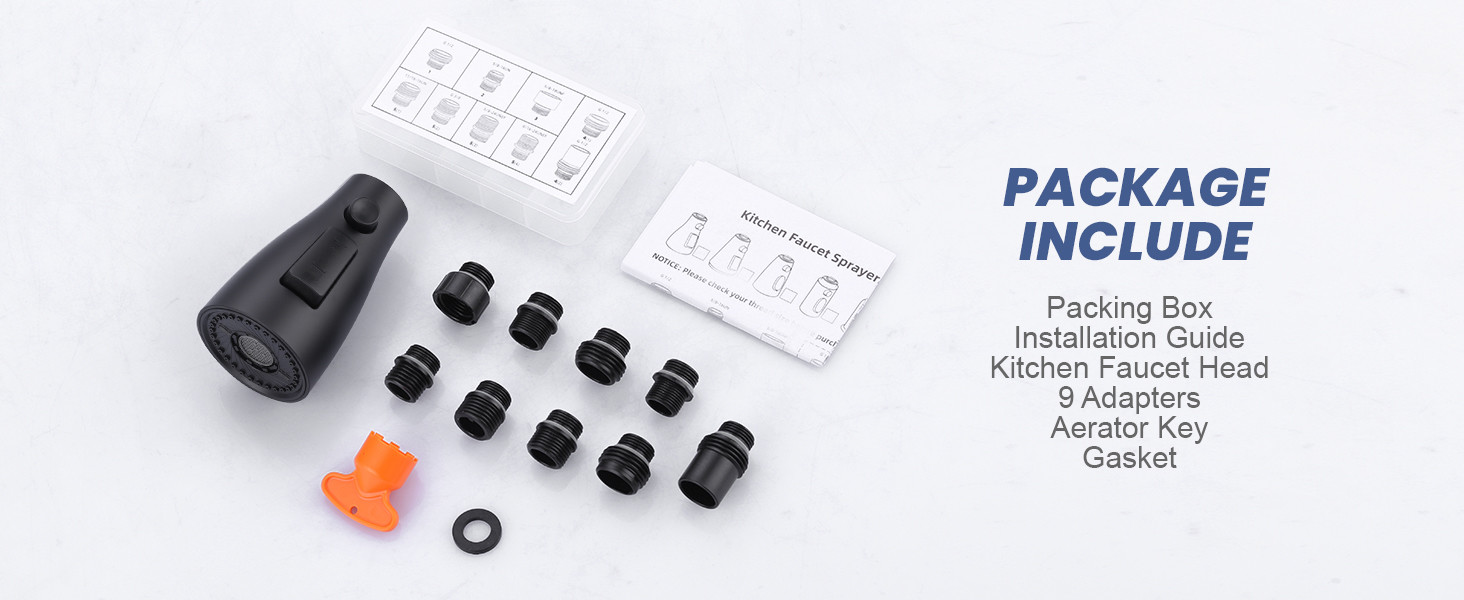 9 CONNECTION SIZES FOR VARIOUS HOSE TYPES: This sink faucet head comes with 9 adapters for a variety of connections and is compatible with major brands of faucet hoses, not limited to compatible with Moen, Delta, American Standard, AquaSource, Hansgrohe and Grohe. Please note only fits most faucets, not all(such as curved shape faucet)