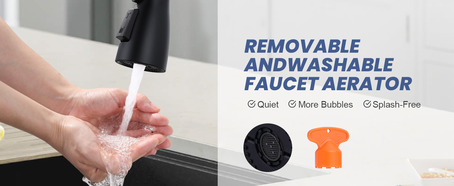 REMOVABLE & WASHABLE FAUCET AERATOR: Comes with a free aerator key for removing or replacing the faucet aerator for cleaning. The internal multi-mesh aerator creates a quiet, splash-free stream that filters out impurities, ensuring a steady flow of clean water