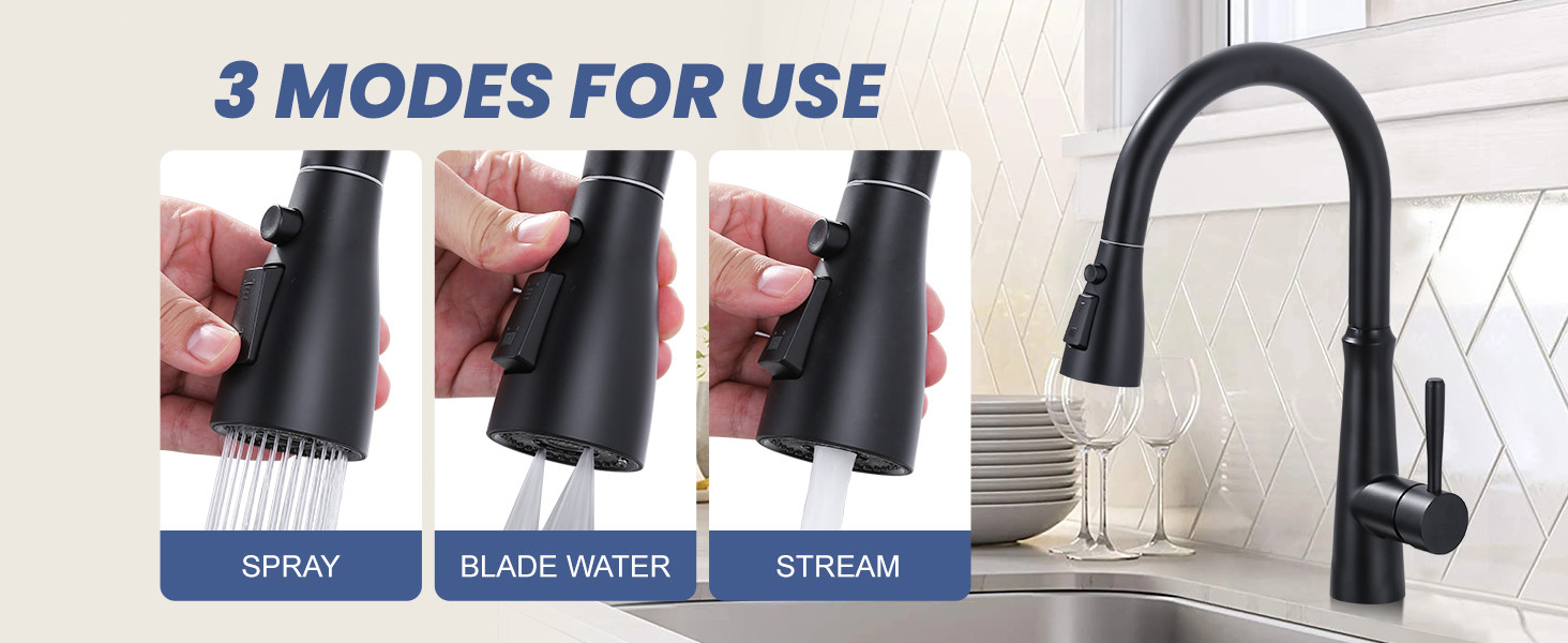 SWITCH EASILY BETWEEN 3 MODES: The kitchen faucet head has 3 types of water modes to meet your different cleaning needs. With just the push of a button, switch between stream mode for gentle cleaning, spray mode for everyday rinsing, and a powerful dual sweep mode to quickly remove stubborn food residues from plates