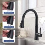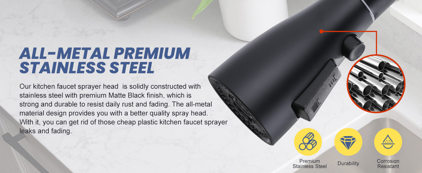 HIGH-QUALITY STAINLESS STEEL MATERIAL: This all-metal pull down faucet head replacement is crafted from high-quality stainless steel, ensuring exceptional durability and rust resistance. The matte black finish features a multi-layer plating process for enhanced fade resistance, keeping your faucet looking great over time