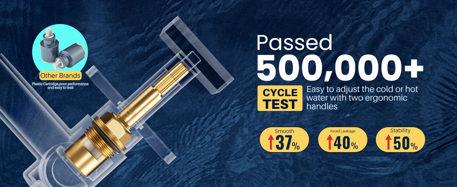 【Dual Square Handles】Its 2 square handles control both the water volume and temperature operations to make using it exceptionally easy. When paired with a two brass disc cartridge, tested to be drip-free after 500,000 times, this trim offers optimal performance.