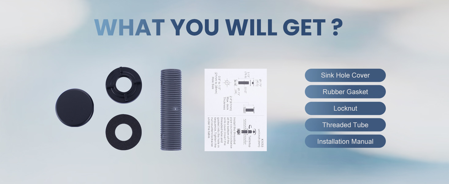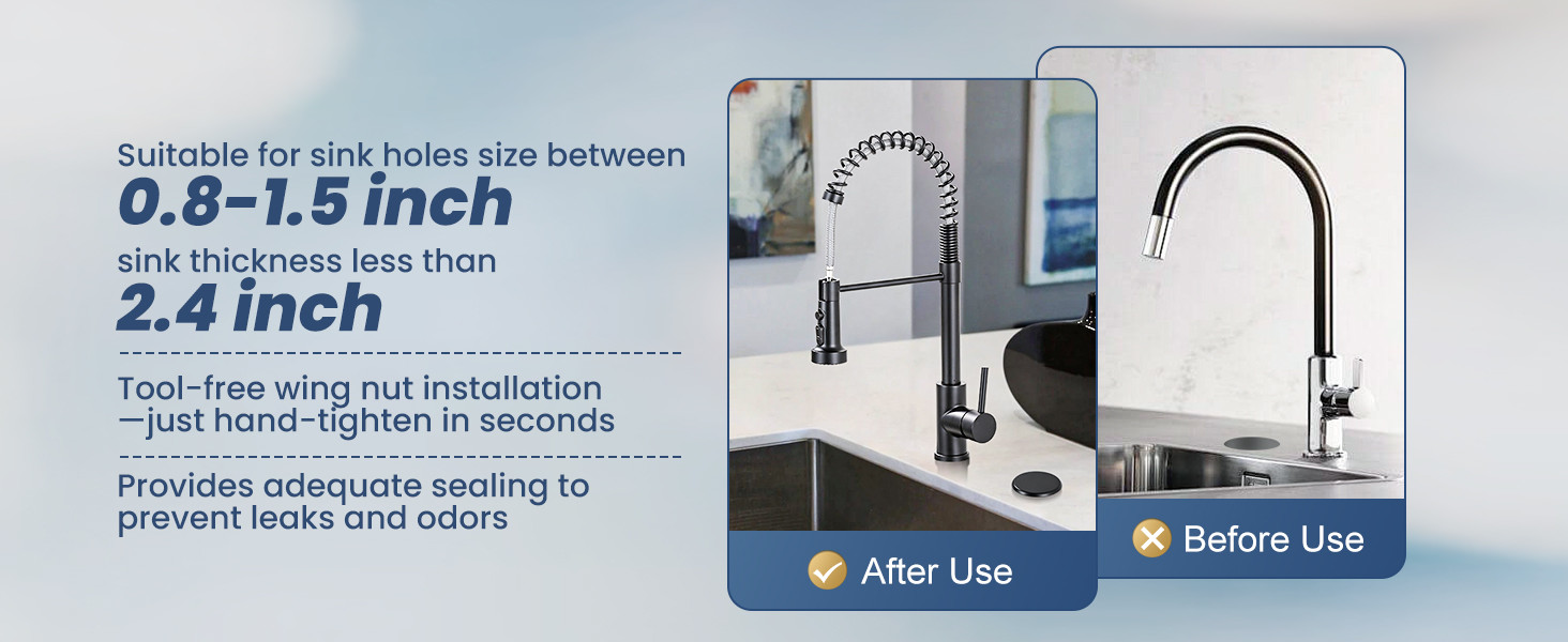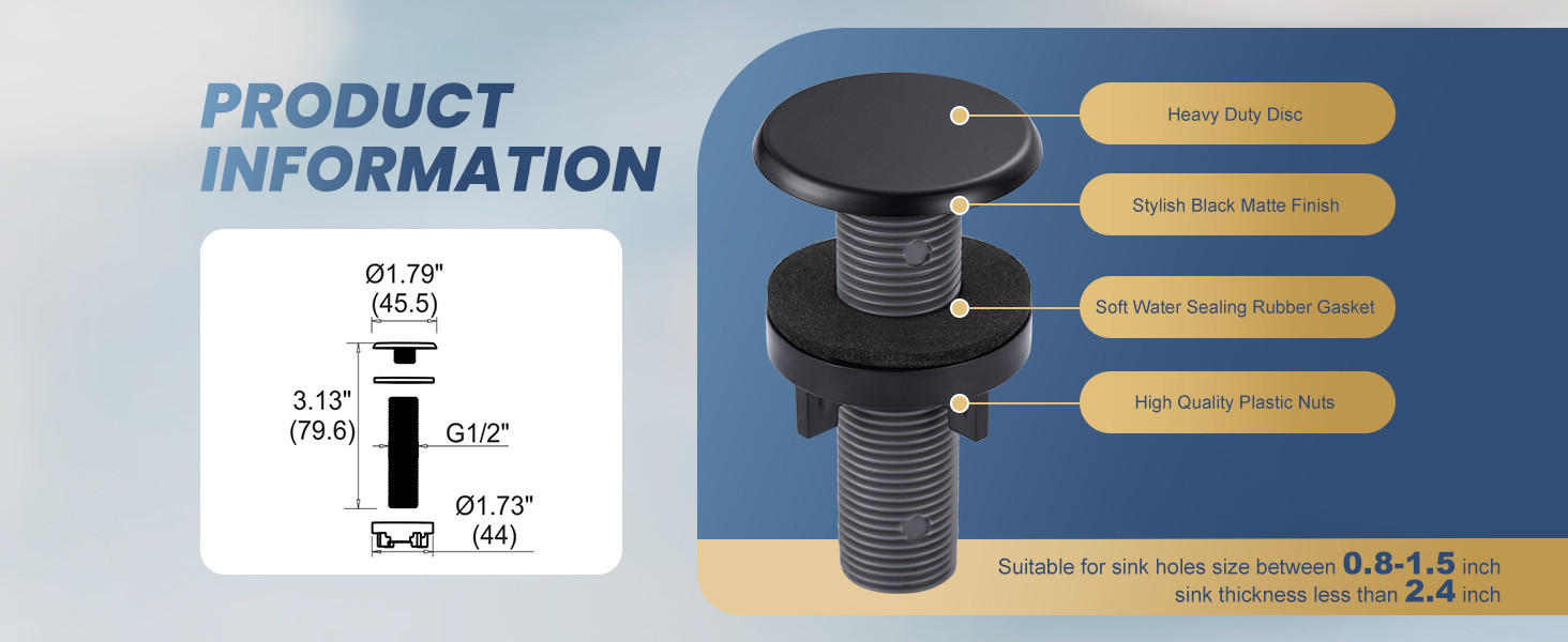 Perfect Fit for Most Sinks: With a 3.1-inch handle, 1.8-inch cover diameter, and G 1/2-inch thread size, this kitchen sink hole cover fits most kitchen and bathroom sink holes. The long thread length also accommodates thicker countertops, including granite
