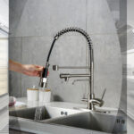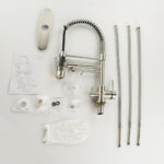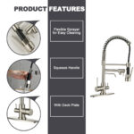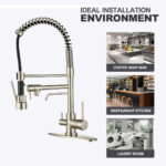 The commercial pull down kitchen faucet is made of high quality solid brass material, anti-corrosion and anti-rust, durable, and is a great choice for upgrading the quality of your kitchen. This kitchen faucet features a unique three-way water dispensing function, which includes a dedicated drinking water faucet, the 3-in-1 design brings you the ultimate experience while also helping you save limited countertop space. Double handle design to achieve precise control of water temperature and flow, 360 rotating spout for your kitchen work adds more flexibility, with pull-out spring, can let the water flow into all corners of the sink, to help you complete a full range of cleaning of the sink. The model’s stainless steel hose is flexible and has a wide range of motion, allowing it to spray water exactly where it’s needed. The spring helps maintain its shape and keeps the spray valve above the sink.