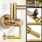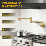 Upgrade your kitchen with this fantastic wall mounted faucet! Crafted from 100% solid brass, it’s built to last, featuring a drip – free brass cartridge that ensures no annoying leaks.With dual joint swing arms, it offers 360?? rotation and extends up to 23.6 in. giving you ample reach for filling pots or cleaning large items. The faucet aerator mixes air with water for a steady, no splash stream.Not only is it practical, but it also looks great. The bright, corrosion-resistant surface is easy to clean and will not fade, it is made with healthy food-grade materials, so you can feel good about using it. Whether you are a home mounted cook or love hosting, this wall faucet is a perfect addition to your kitchen.