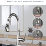 Upgrade your kitchen with this single handle pull down kitchen faucet that gives you an unprecedented experience for all your daily water needs. The 360 high arc spout faucet is made of high quality stainless steel that is corrosion-resistant, fingerprint-free, and durable. This faucet also features three functions including water flow, spray and pause to meet your daily needs. Equipped with a high-capacity soap dispenser, it brings convenience to your daily cleaning and is ideal for those who emphasize convenience and cleanliness. The pull-out kitchen faucet has a sleek and modern design that keeps your kitchen clean and fresh and fits most decorating styles.