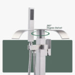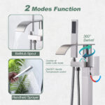 Floor standing bathtub faucet spout features a unique waterfall design, giving you a comfortable and soft water flow to optimize your bathing experience. The main body of the bathtub faucet is made of high-quality solid brass material, which can effectively prevent discoloration and corrosion from daily use and complement the humid bathroom environment. The surface of the faucet adopts multi-layer plating technology, which is not easy to produce scratches and stains, and the surface is bright and smooth, with a delicate and fashionable appearance. The spout has a large water volume of 2GPM, which easily and quickly fills the bathtub, saving your daily bathing time and providing you with a great bathing experience. The easy-to-operate single handle design allows you to precisely control the water temperature and water flow, and the switching valve inside the handle helps you to easily switch between the hand shower and the high arch bathtub faucet spout. The modern and comfortable round wand hand shower features non-clogging nozzles made of natural silicone material and comes with a matching 59-inch double-screw stainless steel shower hose for tub rinsing or after-bath rinsing.
